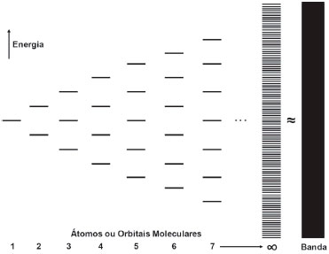 A TEORIA DE BANDA Por definiçao simples, um semicondutor é um material com condutividade elétrica mensurável que, ao contrário dos condutores metálicos, aumenta com a temperatura. Para compreender melhor os seus mecanismos de conduçao, é importante conhecer um pouco de suas características físicas e, principalmente, alguns dos princípios da teoria do orbital molecular. Os sólidos podem ser considerados a uniao de um número virtualmente infinito de átomos, de modo que o seu posicionamento sucessivo em linha leva à superposiçao dos orbitais adjacentes para a formaçao de ligaçoes. Através da combinaçao linear de dois orbitais atômicos é originado um orbital molecular ligante e um orbital molecular antiligante (dois orbitais moleculares). A medida que mais átomos sao enfileirados, mais orbitais moleculares sao formados pela interferência das funçoes de onda de seus orbitais atômicos, levando à formaçao de um conjunto de orbitais nao-degenerados com baixa diferença de energia entre níveis consecutivos. Sugere-se de modo aproximado a formaçao de um contínuo de níveis de energia entre o orbital ligante de menor energia e o orbital antiligante de maior energia, a chamada banda (Figura 1). Quanto maior a força de interaçao entre os átomos vizinhos, maior é a diferença de energia entre esses níveis e, portanto, mais larga é a banda. O aumento do número de átomos enfileirados e orbitais moleculares formados eleva o número de níveis internos da banda e a chamada densidade de estados (número de níveis contidos em uma fraçao de largura infinitesimal da banda), reduzindo a diferença de energia entre níveis consecutivos e tornando o modelo ainda mais próximo do real.11
