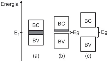 ![]() Figura 2. Representaçao esquemática de diagramas de bandas típicos para (a) condutores eletrônicos (p. ex. metais), (b) semicondutores e (c) isolantes. Eg: Band Gap; BV: banda de valência; BC: banda de conduçao; Ef: nível de Fermi a 298,15 K; Sombreamento cinza aponta a presença de estados ocupados com capacidade de transporte de carga