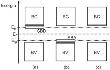 ![]() Figura 3. Representaçao esquemática de um diagrama de bandas para semicondutores extrínsecos (a) do tipo n e (b) p em comparaçao a (c) um intrínseco. BC: banda de conduçao; BV: banda de valência; Ef: nível de Fermi do semicondutor intrínseco; Efn: nível de Fermi do semicondutor n; Efp: nível de Fermi do semicondutor p; SBD: sub-banda doadora; SBA: sub-banda aceptora. Diagrama esquemático representado à temperatura ambiente (≈ 298,15 K). Sombreamento cinza gradual apontando a presença de níveis acessíveis para transporte de carga