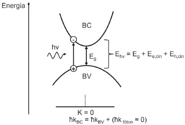 ![]() Figura 4. Representaçao esquemática da transiçao eletrônica direta de um elétron da banda de valência (BV) à banda de conduçao (BC) em um semicondutor de Band Gap direto. Ehν = energia do fóton; Eg = Band Gap; Ee,cin = energia cinética do elétron na banda de conduçao; Eh,cin = energia cinética da lacuna na banda de valência; ћ constante reduzida de Planck (ћ = h/2π); kBC, kBV e kfóton = vetor de onda do elétron na banda de conduçao, da lacuna na banda de valência e do fóton. Adaptado da tese de Groeneveld20
