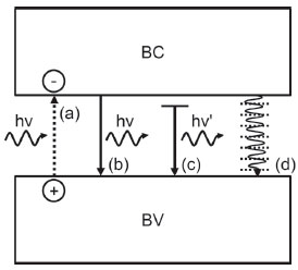 ![]() Figura 5. Ilustraçao esquemática apresentando os diferentes tipos de recombinaçao de transportadores de cargas vista em semicondutores: (a) excitaçao; (b) recombinaçao radiativa (c) recombinaçao radiativa assistida por um defeito ou estado superficial (v>v'); (d) recombinaçao nao-radiativa. Adaptado da tese de Groeneveld20