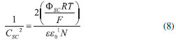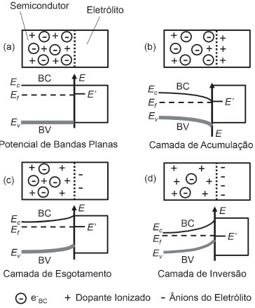 em que "EB" é o potencial (ou energia) de arqueamento de banda (Band Bending), "Ef" é o potencial relativo ao nível de Fermi, E' é o potencial formal desenvolvido pela espécie eletroativa na interface. Caso haja acúmulo de elétrons pelo lado do semicondutor na interface e a induçao de carregamento positivo na dupla-camada elétrica, observa-se a formaçao da camada de acumulaçao (Figura 6b). Por outro lado, se os elétrons forem esgotados na interface do semicondutor, cargas positivas imóveis provindas dos estados doadores ionizados do dopante (semicondutor tipo n) sao deixadas para trás, havendo a formaçao da camada de esgotamento (Figura 6c) com carregamento negativo da dupla camada elétrica. Caso o esgotamento de elétrons prossiga a uma extensao com concentraçao inferior ao nível intrínseco, a superfície adquire caráter p (excesso de cátions imóveis do dopante) frente ao bulk do material, sendo possível a formaçao da camada de inversao (Figura 6d).27 O potencial de banda plana (EFB) é um parâmetro importante para ser determinado por auxiliar na determinaçao do nível de Fermi e, consequentemente, no potencial da banda de conduçao.27 Sua determinaçao pode ser feita pela medida da capacitância da junçao semicondutor-eletrólito em potenciais crescentes para polarizaçao reversa da junçao, na qual o modelo de Mott-Schottky se aplica.28