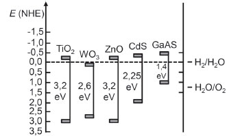 ![]() Figura 7. Diagrama de posiçao de bandas para alguns exemplos de semicondutores apresentando as respectivas posiçoes em V frente ao eletrodo normal de hidrogênio (NHE) em pH = 1, o Band Gap de cada material (eV) e a posiçao do potencial padrao (vs. NHE) de um exemplo de reaçoes redox para a decomposiçao da água em hidrogênio e oxigênio. Adaptado do trabalho de insight de Grätzel27