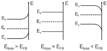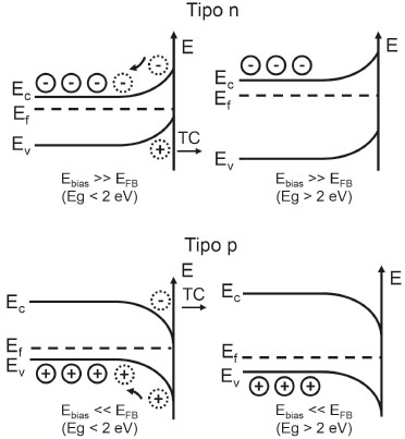 ![]() Figura 8. Fenômeno de arqueamento de bandas (band bending) para um semicondutor intrínseco sob diferentes condiçoes de polarizaçao pela aplicaçao de um potencial externo no substrato condutor. Ebias: potencial de polarizaçao do substrato; EFB: potencial de banda plana; Ef: nível de Fermi; EV: potencial da borda da banda de valência; EC: potencial da borda da banda de conduçao. Adaptado da obra FINKLEA14