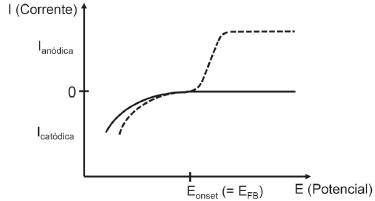 ![]() Figura 10. Voltamogramas apresentando a dependência da corrente no escuro (--) e da fotocorrente (---) com a aplicaçao de potencial de polarizaçao crescente em eletrodo de semicondutor extrínseco n. Eonset: potencial no qual se inicia a medida de corrente anódica; EFB: potencial de banda plana. Baseado em figura da obra de Finklea14