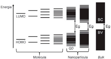 ![]() Figura 11. Organizaçao dos níveis de energia ou orbitais moleculares partindo (da direita à esquerda) de uma molécula diatômica ao bulk. Eg: Band Gap; BC: banda de conduçao; BV: banda de valência; LUMO: lowest unoccupied molecular orbital; HOMO: highest occupied molecular orbital; QD: quantum dots. Adaptado da tese de Groeneveld20