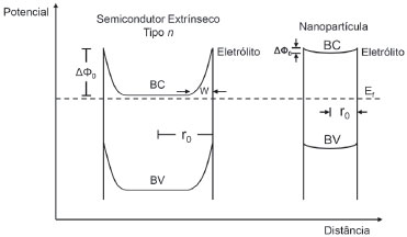 em que Jp é a densidade de fotocorrente; h é a constante de Planck; ν é a frequência da radiaçao incidente; q é o valor de carga fundamental; I0 é o fluxo incidente de fótons, L é o comprimento de difusao para os transportadores minoritários fotogerados; W é a espessura da camada de esgotamento; A é uma constante; Eg é a energia de Band Gap; e m é o fator de transiçao do Band Gap (direto ou indireto). Ao plotar um gráfico de log [Jphν/qI0] vs. Log (hν - Eg) sob potencial de polarizaçao constante, obtêm-se uma funçao de dependência linear com coeficiente angular igual a ½ (m = 1 para Band Gap direto) ou 2 (m = 4 para Band Gap indireto). Em outra abordagem, ao plotar [(Jphν/qI0)]2/m vs. hν obtêm-se o valor de Eg do semicondutor como intersecçao do eixo das ordenadas (coeficiente linear da funçao). Na abordagem apresentada até aqui, pode-se perceber a importância dada aos modelos de space-charge layer para o desenvolvimento da ciência de semicondutores e, mais especificamente, a versatilidade dos ensaios fotoeletroquímicos na sua caracterizaçao a ponto de até propriedades fundamentais puramente ópticas poderem ser determinadas por eles. Com o desenvolvimento da ciência de nanomateriais, muitos desses conceitos fortemente sedimentados ao final da década de 1980 foram revistos vez que nao se aplicavam aos filmes compostos por nanopartículas. Dentre esses conceitos pode-se apontar a refutaçao inclusive do desenvolvimento de uma space-charge layer,38 como será discutido no tópico a seguir.