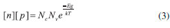 em que σ é a condutividade em S cm, σ0 é um fator pré-exponencial, Eg é a energia de separaçao entre a borda das bandas (Band Gap), k é a constante de Boltzmann e T é a temperatura absoluta em Kelvin. Qualitativamente, é possível concluir que o gap de energia entre o fundo da BC e o nível de Fermi (EBC - Ef) é um parâmetro determinante da condutividade de um semicondutor intrínseco ou isolante, qualquer que seja a temperatura de estudo. Inclusive, esse pode ser o principal parâmetro de diferenciaçao, uma vez que isolantes até podem ser considerados semicondutores em temperaturas elevadas e, em zero Kelvin, todo semicondutor será um isolante. Um novo rearranjo da Eq. 2, apresentado abaixo na Eq. 3, explicita a relaçao de decaimento exponencial do produto das concentraçoes dos transportadores intrínsecos (lacunas e elétrons) com a energia de Band Gap (Eg), atenuado pela energia térmica do sistema (kT) e de acordo com um fator pré-exponencial correspondente à densidade efetiva de estados nas bordas das bandas de conduçao e valência, Nc e Nv respectivamente:14