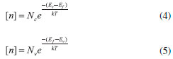 Como representado na Figura 3, a posiçao do nível de Fermi (Ef) observada no semicondutor intrínseco é deslocado de acordo com o tipo de dopagem. A temperatura ambiente, o nível de Fermi encontra-se aproximadamente na metade do Band Gap. Mantendo-se a temperatura constante, o nível de Fermi se desloca linearmente em funçao do logaritmo da densidade de dopagem seguindo no sentido de valores mais próximos da borda da banda de conduçao para o tipo n e da de valência para o tipo p.14-16 A distância do Ef à borda da banda adjacente é um fator importante para determinar a concentraçao do transportador majoritário ([n] ou [p]), como mostrado a seguir nas Eqs. 4 e 5, deduzidas a partir da Eq. 3.