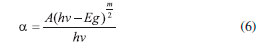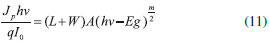 em que Jp é a densidade de fotocorrente; I0 é fluxo de fótons incidente; W é a espessura da camada de esgotamento; L é o comprimento de difusao para os transportadores minoritários fotogerados; q é o valor de carga elementar; e α é o coeficiente de absorçao do material. O rearranjo da Eq. 10 com a Eq. 9 e a Eq. 6 leva a um modelo capaz de descrever completamente a camada de esgotamento em termos da resposta de fotocorrente-potencial e fotocorrente-comprimento de onda. Através da manipulaçao desenvolvida por Fornarini et al.,37 é possível gerar relaçoes lineares simples que levam à determinaçao da energia do Band Gap e do tipo de transiçao (direto ou indireto) do semicondutor. Ao utilizar comprimentos de onda em que nao se observa uma forte absorçao por parte do semicondutor, p. ex. próximo à Eg, a luz é capaz de penetrar além da camada de esgotamento e, com αW e αL << 1 a Eq. 10 pode ser transformada na Eq. 11.