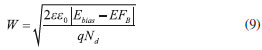 De fato, como o nível de Fermi em um semicondutor intrínseco encontra-se no meio do Band Gap, a polarizaçao até pode induzir ao arqueamento e leve acúmulo de carga na interface, mas mesmo quando Ebias >> EFB ou Ebias << EFB, todos os efeitos práticos sao dependentes do Band Gap (Eg) e, portanto, dos níveis intrínsecos de transportadores que costumam ser baixos para Eg > 0,5 eV. Entretanto, caso o semicondutor intrínseco seja livre de estados superficiais, absolutamente todo o potencial aplicado diferente do EFB é aproveitado no fenômeno de arqueamento de bandas e essa condiçao interessante pode ser extrapolada a semicondutores extrínsecos p e n.14 Em um semicondutor extrínseco, a magnitude do potencial aplicado é de suma importância para a caracterizaçao do modelo de SCL desenvolvido. Ao polarizar levemente o substrato com Ebias > EFB em um semicondutor n, ambas as bandas sofrem um arqueamento positivo de modo que a BC se distancia do Ef e a BV se aproxima. Mas, como o nível de Fermi ainda se encontra bastante distante da BV mesmo após o arqueamento, o que realmente se observa é o esgotamento de transportadores na interface, formando a camada de esgotamento (Figura 6C). O mesmo pode-se dizer de um semicondutor p levemente polarizado negativamente (Ebias < EFB), com a diferença de que se observa um arqueamento negativo com afastamento da BV do Ef e leve aproximaçao da BC.14 Sob esse modelo de esgotamento, além de ser possível a determinaçao do EFB através do modelo de Mott-Schottky como anteriormente descrito (Eq. 8) é possível estimar a espessura (W) da SCL: