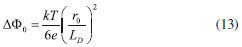 em que ΔΦ0 é a diferença de potencial entre o centro e a borda da partícula; k é a constante de Boltzmann; T é a temperatura absoluta em Kelvin; r0 é o raio da partícula; e LD é o comprimento de Debye (LD decai proporcionalmente com a raiz quadrada da concentraçao de dopante). Como o raio de nanopartículas é pequeno, a dopagem deve atingir valores altos para que o comprimento de Debye decaia suficientemente e aumente a diferença de potencial entre as bordas e o núcleo da partícula, havendo assim o desenvolvimento de um campo elétrico com efeito prático. Com o esgotamento de transportadores majoritários protagonizado principalmente pela percolaçao de eletrólito no filme nanoparticulado,41 conclui-se que a principal forma de transporte de carga através das partículas é a difusao. Uma regra prática mostra que a diferença, de potencial entre as bordas e o núcleo das partículas deve atingir o valor de 50 mV para que o transporte seja realizado predominantemente por migraçao elétrica ao invés de difusao.38 Valores abaixo disso denotam um campo desprezível, podendo-se igualmente desprezar a formaçao de space-charge layer (Figura 12). Sugere-se, nessa circunstância, que o eletrodo permanece com bandas planas e que qualquer variaçao de potencial deve decair na camada de Helmholtz ([eletrólito] > 0,1 mol L-1), representando uma mudança na posiçao da borda das bandas.