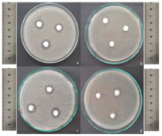![]() Figura 1. Resultados dos testes de difusao em meio sólido a partir de orifício para as NPs-ZnO e MCs-Zn. (a) NPs-ZnO/S. aureus, (b) NPs-ZnO/E. coli, (c) MCs-Zn/S. aureus, (d) MCs-Zn/E. coli
