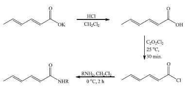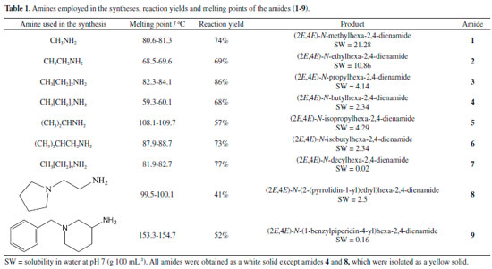 ![]() Figure 1. Syntheses of the amides (1-9) from potassium sorbate. Amines employed in the syntheses, reaction yields and melting points of the amides are described in Table 1