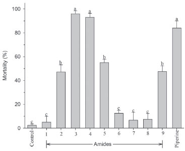 ![]() Figure 2. Mortality (mean ± standard error) of second instar larvae of the insect pest Ascia monuste caused by the application of nine synthetic amides, piperine (dose = 30 mg per g of insect) and control. The means of histograms followed by the same letter do not differ as estimated by the Tukey test at P < 0.05