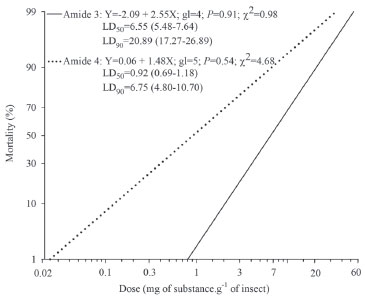 These results indicate that the variation in the chemical structures of amides was not related to its insecticidal activity as the nine amides studied have similar structures. In this context, substances with similar chemical structure may have different insecticidal activity. That is, two isomers can have different insecticidal activity, with one having low activity while the other having high activity.8,15,26 Generally, substances with lower molecular weight and less solubility in water tend to have higher insecticidal activity. This difference is due to greater penetration of these molecules into the insect's cuticle.27-29 However, this has not been noted here as the solubility and molecular weight of the amides were not related to their insecticidal activities. When A. monuste larvae were exposed to different doses of the substances, we observed that amide 4 showed a lower LD50. Therefore, amide 4 was more toxic to the pest than amide 3. The slope of the curve dose-mortality for A. monuste for amide 3 was higher than the slope of this curve for amide 4 (Figure 3).