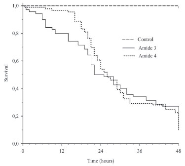 ![]() Figure 4. Survival curves for second instar larvae of the insect pest Ascia monuste for the control and when submitted to the LD90 of amides 3 and 4