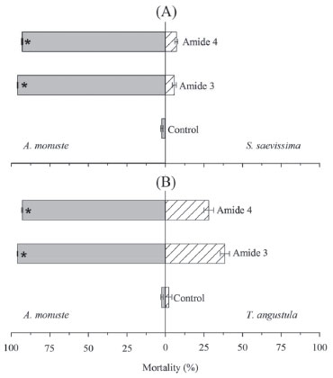 ![]() Figure 5. Comparison of the mortality (mean ± standard error) caused by amides 3 and 4 to second instar larvae of the insect pest Ascia monuste and those observed for (A) the predator Solenopsis saevissima and (B) pollinator bee Tetragonisca angustula. The asterisk (* in the bars) indicates that the mortality of the pest under this treatment was higher than the predator or pollinator according to the t-test at P < 0.05. The dose used was the LD90 for the A. monuste larvae