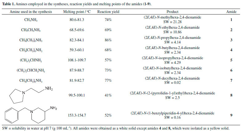 EXPERIMENTAL General The progress of the reactions was monitored by visualization of thin layer chromatography plates (TLC) in an ultraviolet irradiation chamber with a 254-nm lamp.19 All compounds were purified using column chromatography on silica gel (60-230 mesh). Melting points were obtained using a MQAPF-301 melting point apparatus and were not corrected. Infrared (IR) spectra were acquired using a PERKIN ELMER SPECTRUM 1000 spectrometer. The samples were analyzed as KBr pellets. Nuclear magnetic resonance (NMR) spectra were recorded using a Varian Mercury 300 MHz spectrometer using CDCl3 as solvent. The 1H NMR chemical shifts were reported using the residual signal of CHCl3 (δ = 7.27 ppm) as a reference. 13C NMR chemical shifts were recorded using the CDCl3 signal (δ = 77.0 ppm) as a reference. The mass spectra were obtained using SHIMADZU GC-MS-QP5050A and GC-MS-QP2010 Ultra equipment after 70 eV electron impact ionization (EI). Synthesis of amides Nine dienamides were synthesized from potassium sorbate. Potassium sorbate (10 g, 67.5 mmol) was suspended in CH2Cl2 (100 mL) and acidified with hydrochloric acid 1 mol L-1 (100 mL) in a separating funnel. The mixture was shaken for 10 min, and the organic phase was separated. The aqueous phase was extracted with CH2Cl2 (50 mL), and the combined organic phase was dried with magnesium sulfate. The hydrated magnesium sulfate was removed by filtration and the filtrate was concentrated under vacuum to afford the (2E,4E)-hexa-2,4-dienoic acid. Oxalyl chloride (1.0 mL, 11.5 mmol) was added to a solution of (2E,4E)-hexa-2,4-dienoic acid (0.5 g, 4.46 mmol) in anhydrous CH2Cl2 (20 mL). Subsequently, the solvent and excess oxalyl chloride were removed under reduced pressure in a rotary evaporator to afford a green oil. The green oil was dissolved in dry CH2Cl2 (20 mL) and transferred to a round-bottomed flask. The corresponding amine (11.5 mmol) was added to the ice-cooled reaction mixture (Table 1) and was stirred under a nitrogen atmosphere for two hours. The solvent was removed on a rotary evaporator under reduced pressure, and the residue was chromatographed on a silica gel column using a mixture of hexane and ethyl acetate as eluent to afford amides (1-9), which are shown in Table 1.
