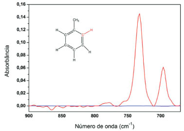 ![]() Figura 3. Espectro de infravermelho obtido na fase sensora de poliuretano (em vermelho) após extraçao por 60 minutos em água contendo 80 mg L-1 de tolueno e do branco do filme de PU (em azul). Os dados foram obtidos com correçao de linha de base