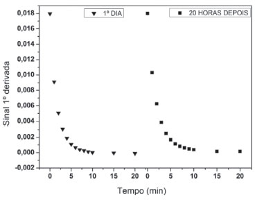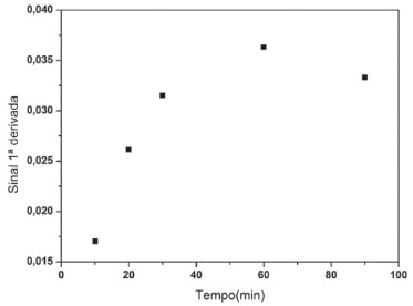 ![]() Figura 4. Perfil do sinal da 1ª derivada em funçao do tempo de exposiçao de fases sensoras de poliuretano em contato com soluçoes de 80 mg L-1 de tolueno. Banda 728 cm-1