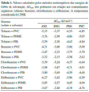 RESULTADOS E DISCUSSAO Validaçao dos métodos computacionais e a escolha de uma nova fase sensora Com o objetivo de auxiliar na prediçao de aspectos de interaçao entre uma fase sensora de matriz polimérica e contaminantes orgânicos, foram realizados cálculos de efeito solvente por um conjunto de métodos semiempíricos. Foi escolhida a propriedade termodinâmica de energia de Gibbs de solvataçao, ΔGsolv, de forma a verificar se cada matriz agindo como solvente poderia afetar a energia de Gibbs de formaçao do contaminante orgânico em diferentes intensidades. A Tabela 1 apresenta os valores de energia de Gibbs de solvataçao das matrizes poliméricas, PVC, PDMS e PIB, em relaçao aos contaminantes orgânicos: tolueno, benzeno, clorobenzeno e etilbenzeno.