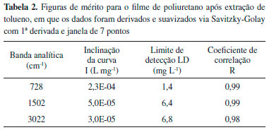Figuras de mérito Para a estimativa das figuras de mérito foram considerados o coeficiente de correlaçao linear, R, a sensibilidade da curva analítica estimada como a inclinaçao da curva, I, e o limite de detecçao, LD, com fator k igual a 3. O desvio padrao do branco (SDbranco) foi calculado para os dados referentes a cinco extraçoes de soluçoes sem o analito (branco) nas fases sensoras de poliuretano. Para a construçao da curva analítica, foram utilizadas soluçoes aquosas de tolueno nas concentraçoes 20, 40, 60, 80 e 100 mg L-1 e soluçoes sem o analito, ambos com adiçao de cloreto de sódio e metanol, em quantidades já descritas. Os resultados foram avaliados em diferentes comprimentos de onda, com os dados sem tratamento, dados derivados (1ª derivada com suavizaçao Savitzky-Golay com janelas de 7 pontos), dados normatizados e com correçao de linha de base, utilizando para isto o programa The Unscrambler X versao 10.2 (CAMO S.A.). Aspectos cinéticos Para a investigaçao sobre o tempo de extraçao da fase sensora, construiu-se uma curva do sinal analítico versus o tempo de exposiçao a uma soluçao de 80 mg L-1 de tolueno. Esta concentraçao foi indicada nos estudos cinéticos do BTEX em PVC,19 podendo comparar a fase de poliuretano. Os tempos investigados foram de 10, 30, 60 e 90 minutos. É importante destacar que para cada análise uma nova fase sensora foi utilizada. Regeneraçao da fase sensora Para o estudo da possibilidade de regeneraçao da fase sensora, um filme de PU foi inserido em uma soluçao de 80 mg L-1 de tolueno e mantido sob agitaçao durante 60 minutos. Após este tempo, a fase sensora foi removida da soluçao, seca com papel absorvente e levada para o espectrofotômetro de infravermelho onde foram obtidos espectros durante 20 minutos. Após 20 horas, a mesma fase sensora foi colocada em uma nova soluçao de 80 mg L-1 de tolueno, num tempo de 60 minutos de extraçao e foram adquiridos os espectros por 20 minutos, sob as mesmas condiçoes.