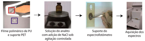 PARTE EXPERIMENTAL Materiais e reagentes Foram utilizados filmes finos comerciais de poliuretano (PU) com espessura de 0,08 mm, fabricados por 3M/USA e distribuídos por Brasil Ltda, tolueno P.A (Química Moderna), metanol P.A (Dinâmica) e cloreto de sódio P.A (Dinâmica). Preparo das soluçoes A soluçao de referência do tolueno foi preparada em metanol P.A, para uma concentraçao de 50.000 mg L-1. Na preparaçao das soluçoes de concentraçoes de 20, 40, 60, 80 e 100 mg L-1 para construçao da curva de calibraçao, a soluçao de referência foi diluída com água destilada, em que foi mantida uma percentagem final de metanol de 1%. Também foram preparadas soluçoes do branco, feitas apenas com água destilada e 1% de metanol. Espectroscopia de infravermelho Os experimentos na regiao do infravermelho médio foram realizados a partir de medidas de transmitância, em um espectrofotômetro FTIR marca Perkin-Elmer, modelo Frontier, na faixa de 4000 a 400 cm-1, unidade da ordenada em absorbância (A) e unidade da abscissa em número de onda (cm-1). As condiçoes utilizadas para a obtençao dos dados foram uma resoluçao de 8 cm-1 e a utilizaçao de 8 varreduras. Essas condiçoes foram selecionadas por terem sido usadas na detecçao de compostos BTEX.19 Todos os experimentos foram realizados a temperatura ambiente (22 ± 2 ºC). Os filmes de poliuretano foram cortados nas dimensoes de 1 cm x 1,3 cm e anexados em um suporte de garrafa PET nas mesmas dimensoes e com um orifício circular de diâmetro 0,8 cm, garantindo que a radiaçao atravessasse apenas o PU. Inicialmente, um espectro de infravermelho de cada filme de PU foi adquirido para servir como referência e, após isto, um branco foi realizado no filme. Este sistema foi introduzido em uma soluçao em determinada concentraçao do analito contendo 1% de metanol, 1,5 mol L-1 de NaCl e uma barra magnética, e mantido livremente dentro do frasco, sob agitaçao constante e igual para todas as medidas, durante o tempo determinado para cada experimento. Em seguida, a fase sensora anexada ao suporte de PET foi retirada da soluçao, seca com papel absorvente e inserida imediatamente em um suporte no percurso óptico do espectrofotômetro, de forma a se obter o espectro do analito investigado. Este procedimento pode ser visto na Figura 2. O mesmo procedimento foi realizado para as análises do "branco".