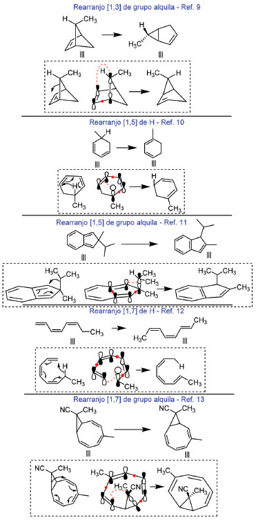 Figura 4. Comparaçao das topologias alternativa (em destaque) e convencional para as reaçoes térmicas do tipo RAC: eletrociclizaçoes e rearranjos sigmatrópicos [1,5] e [1,7]