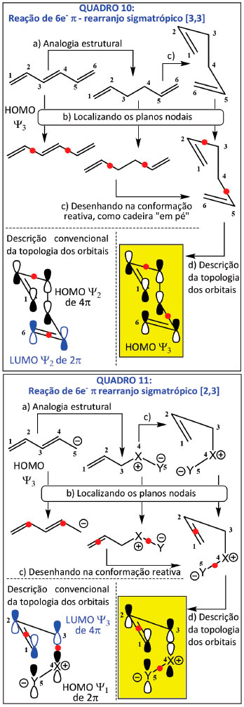 Mesmo nos livros-texto avançados de química orgânica nao é comum encontrar a descriçao da topologia dos orbitais referentes aos rearranjos sigmatrópicos para além os rearranjos [1,3], [1,5] e [1,7].4 Por este motivo, apresentamos a comparaçao entre o tratamento convencional e o alternativo aqui proposto para os rearranjos sigmatrópicos [3,3] e [2,3]. O tratamento convencional da topologia dos orbitais explica estas duas reaçoes intramoleculares considerando, simultaneamente na mesma molécula, uma porçao HOMO e outra LUMO conectadas por uma ligaçao sigma envolvida na reaçao. Já na topologia alternativa, de forma mais simples, é empregado apenas o orbital HOMO de 6 elétrons π envolvendo os átomos 1 a 6 e 1 a 5 nos rearranjos [3,3] e [2,3], respectivamente, Figura 5. Como protótipo para explicar o rearranjo sigmatrópico [3,3] é empregada, na Figura 5, a analogia entre o 1,3,5-hexatrieno e o 1,5-hexadieno, seguindo o procedimento comentado na Figura 2. Como em polienos conjugados o número de planos nodais de um dado orbital molecular Ψn é n-1, no 1,3,5-hexatrieno temos três pares de elétrons π que demandam três orbitais moleculares, sendo assim Ψ3 o HOMO. Portanto, dois planos nodais sao localizados equidistantes do centro geométrico das ligaçoes π conjugadas, como indicado no Quadro 10 da Figura 5. É possível redesenhar o 1,5-hexadieno com os carbonos 1 e 6 se aproximando para permitir a sobreposiçao em fase dos orbitais localizados nestes dois átomos, mantendo a disposiçao espacial dos demais átomos na forma cadeira. De forma análoga, o rearranjo sigmatrópico [2,3] é explicado com a topologia do HOMO deduzida, tomando como analogia o ânion pentadienila, como indicado no Quadro 11 da Figura 5. No Esquema 2 sao apresentados exemplos dos rearranjos [3,3] e [2,3] onde é feita a racionalizaçao de cada reaçao empregando a topologia alternativa aqui desenvolvida. Para o último, sao exemplificados casos onde o intermediário é neutro ou dipolar.14-16