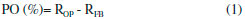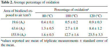 The catalytic effect of temperature on the oxidation process of biodiesel is well known. An increase in the contact area between biofuel and atmospheric air allows major oxygen exchange at the biodiesel/air interface. The amount of oxidation products increases with increasing temperature and area. The percentage of oxidation (in mass %) is calculated using equation (1), as ![]() where PO: Percentage of oxidation, % m/m; ROP: Percentage of residual mass lost from oxidized bgt;max(OxP), % m/m. Table 2 shows the average PO that is formed after the accelerated biodiesel oxidation tests. The tests are conducted at 80, 100 and 120 °C with three different atmospheric exposure areas (A1<A2<A3). The amount of oxidation products atmospheric exposure areas (A1<A2<A3). The amount of oxidation products increases with increasing the temperature and area of biodiesel exposed to atmospheric air.