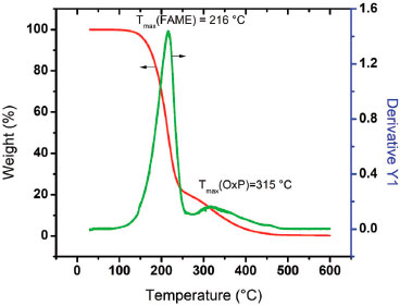 Typical thermogravimetric (TG) and derivative thermogravimetric (DTG) curves of a biodiesel sample oxidized at 120 °C with an exposition area of 63.6 cm2 (A2) is presented in Figure 3 to illustrate the applicability of TGA in the oxidation of biodiesel. The TG curve shows the weight loss as a function of temperature. Clearly two significant steps are observed and confirmed by the DTG curve, which has two evident peaks. The first step is attributed to the esters that compose the biodiesel. The second step is attributed to the oxidation products. The key temperatures are Tmax(FAME) at 216 °C and Tmax(OxP) at 315 °C, which corresponds to the maximum rate of weight loss of fatty acid methyl esters (FAME) and oxidation products (OxPs). The difference between these temperatures allows differentiation of the FAMEs from OxPs.