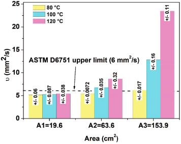 ![]() Figure 5. Kinematic viscosity of oxidized samples of biodiesel at three different temperatures (80, 100, and 120 °C) and three different areas (A1<A2<A3) of exposure to atmospheric air
