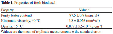 EXPERIMENTAL Biodiesel from waste cooking oil was provided by a biodiesel producer in México (Energía Girón. S. A.). Biodiesel was produced following a typical alkaline-catalyzed transesterification procedure. The waste cooking oil was used after a step of filtration to remove residual food. Then the reaction was carried with a 6:1 molar ratio of methanol to waste cooking in the presence of KOH as a catalyst. Several parameters relevant to the oxidative stability for fresh biodiesel (FB) are listed in Table 1. The purity of the biodiesel was determined from the weight lost due to volatilization of biodiesel in thermogravimetric curves.17 Kinematic viscosity was measured at 40 °C using an Ubbelohde viscometer following the procedure described in ASTM D-445. The density was determined by measuring the specific gravity with a hygrometer (ROBSAN-1107, México) with a range of 0.80 to 0.90 and a Polyscience 9106A11B circulating bath following the ASTM D-1298 standard.