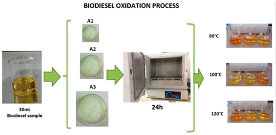 Biodiesel with different oxidation levels were produced with modifications to a method described by Knothe.18 Samples of biodiesel (30 mL) were poured into petri dishes with diameters of 5.0 cm (A1=19.6 cm2), 9.0 cm (A2=63.6 cm2) and 14.0 cm (A3 = 153.9 cm2). A sample without oxidation was used as a blank and coded as FB (fresh biodiesel). The petri dishes containing the biodiesel samples were heated in an oven (Isotemp vacuum oven, Model 281 A, Fisher Scientific, Pittsburgh, PA) to a specific constant temperature (80, 100 or 120 °C). All accelerated oxidation tests were performed at least in triplicate, at a fixed exposure time of 24 h. Figure 1 shows a scheme to illustrate the accelerated oxidation process which was performed with different areas and temperatures in atmospheric air.