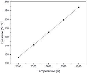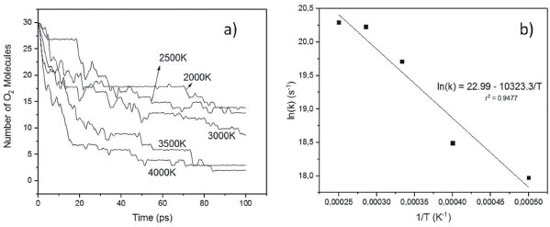 The combustion simulation was done using the condensed phase structure of triethylaluminum in a fuel rich condition (less than stoichiometric quantity of oxygen molecules), in five different temperatures (2000 K, 2500 K, 3000 K, 3500 K and 4000 K). Three dimers of trietylaluminum were inserted in a unit cell measuring 12.4 x 14.4 x 6.9 Å, generating a condensed phase structure with approximate density of 0.92 g cm-3 (experimental density: 0.832 g cm-3). This structure was put in contact with 30 molecules of gaseous oxygen inside a box of 20 x 20 x 20 Å, where the collisions/reactions can occur. The pressure at the beginning of the simulation was calculated using the ideal gas equation of state for the chosen temperatures and can be seen in Figure 1. The high pressure and temperatures used in the simulations facilitates the collisions among molecules, thus decreasing the necessary time and computational costs of the calculations.