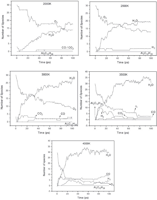 One of the most important parameters for evaluating the evolution and efficiency of a combustion process regards the complete products formation (carbon dioxide and water). As previously stated, the combustion was simulated under a fuel rich condition. Therefore, is expected to have a larger number of water molecules, as the availability and stereo factor of the hydrogen atoms in TEA is much larger than the carbon ones. Also, for being able to produce CO2, the Al-C bonds must be broken, producing C2Hx fragments. These fragments suffer oxidation, producing water, carbon monoxide and carbon dioxide, which is possible if there are enough oxidizer species.