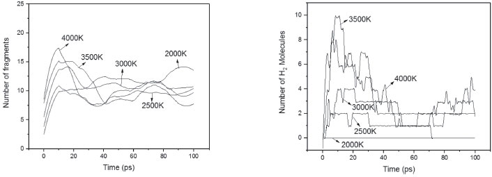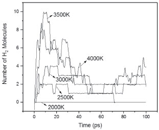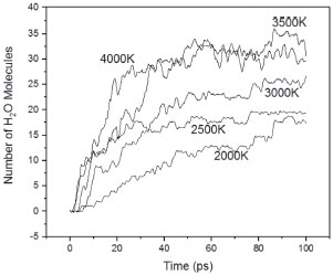 Figure 4 presents the variation of the number of water molecules, showing the same behavior, i.e. the initial production rate of the species is larger at higher temperatures and after 20-30 ps varies according to the combustion mechanism (different elementary reactions activated/possible in each temperature).