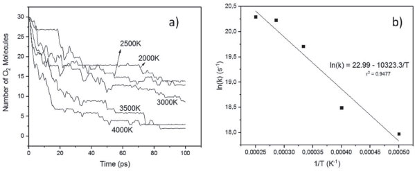 As expected from the Arrhenius equation (ln k∝1⁄T), the rate constant decreases linearly as the temperature increases, with a correlation of 95% among the obtained values from the RMD simulation.