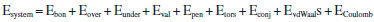 Eval, Epen, Etors sare the valence angle term, penalty energy and torsion energy, respectively;