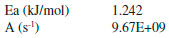 Using the linear equation obtained from the plot, the values of activation energy and frequency factor may be seen below: