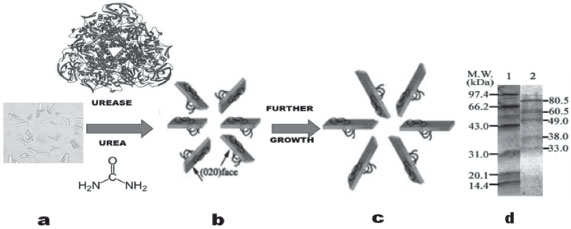 Figure 1. Schematic representation of the formation process of NH4MgPO4.6H2O superstructure constructed from small flakes: a) Seeds crystals; b) Selfassembly into spherical superstructures; c) Aggregated particles; d) SDS-PAGE data showing the proteins generated by Proteus mirabilis. Lane 1: standard protein m.w. markers in kDa. Lane 2: protein bands in P. mirabilis secretions (modified from Chen et al., 2010)41