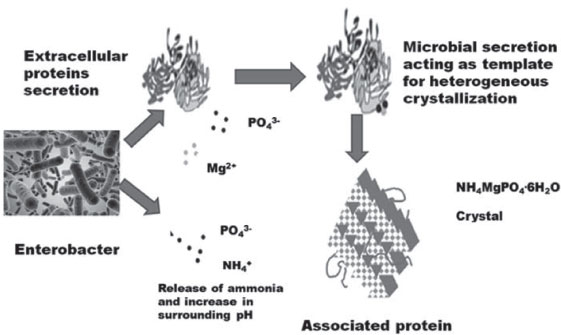 ![]() Figure 2. Scheme representing the probable mechanism of NH4MgPO46H2O formation by Enterobacter sp EMB19 cells (modified from Sinha et al., 2014)42