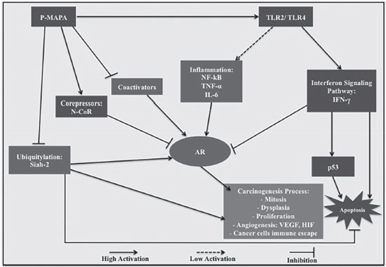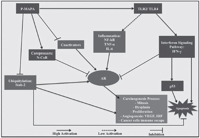 Figure 5. Schematic representation of the hypothetical mechanism of action of P-MAPA involving steroid hormone receptors and co-activators (Siah-2) and co-repressors (N-CoR); TLRs signaling pathway and p53 (created by W .J. Fávaro)