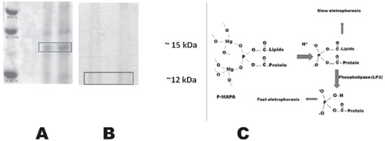 Figure 3. Protein electrophoresis of P-MAPA: A) Protein extracted in acid medium. B) Protein after hydrolysis with phospholipase (PLA2). C) Possible appearance of protein structure after phospholipase hydrolysis