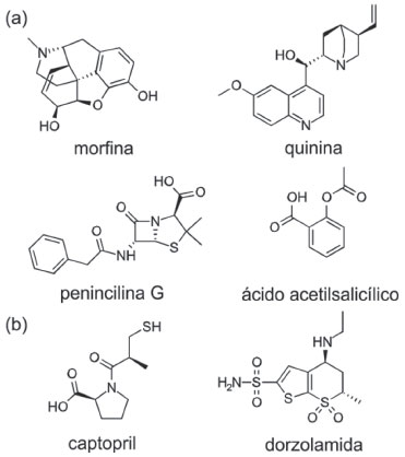 ![]() Figura 1. Representaçao da estrutura 2D de alguns fármacos: (a) extraídos de produtos naturais (morfina, quinina, penicilina G) e semissintético (ácido acetilsalicílico) e (b) desenvolvidos usando SBDD (captopril e dorzolamida)