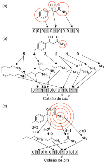 ![]() Figura 2. Representaçao de alguns tipos de fingerprints moleculares: (a) baseado em subestruturas-chave, (b) topológico ou path-based e (c) circular
