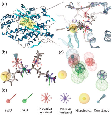 ![]() Figura 3. Representaçao de um modelo farmacofórico típico gerado a partir do complexo ligante-receptor: (a) reconhecimento das interaçoes no complexo ECA-lisinopril (Ki = 0,27 nmol L-1)118 usando o programa LigandScout,117 (b) modelo farmacofórico sobreposto ao lisinopril, (c) modelo farmacofórico utilizado na busca virtual e (d) tipos de regioes de interaçao ECA-lisinopril reconhecidas pelo LigandScout,117 sendo HBD e HBA regioes doadora e aceptora de ligaçao de hidrogênio, respectivamente. Complexo ECA-lisinopril obtido diretamente do PDB (código 1O86, resoluçao de 2,0 Å118