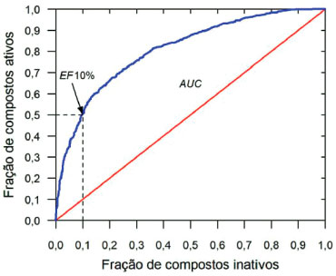 ![]() Figura 4. Representaçao da curva ROC típica mostrando a obtençao da AUC e do fator de enriquecimento (EF) de 10%. Nesta curva, cada ponto representa a fraçao de ativos/inativos selecionados para um dado valor de escore, partindo-se do maior valor de escore até o menor. A linha vermelha representa uma curva com AUC igual a 0,5 (esperada se os compostos tivessem sido selecionados aleatoriamente). Neste exemplo, os valores da AUC e do EF10% sao iguais a 0,81 e a 5 (0,5/0,1), respectivamente