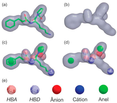 ![]() Figura 5. Representaçao de um modelo típico baseado no formato gerado a partir da estrutura 3D do ligante: (a) estrutura 3D do lisinopril (Ki = 0,27 nmol L-1 118) sobreposta ao modelo baseado no formato ("shape") gerado pelo programa ROCS,136,139 (b) modelo usado na busca virtual por formato, (c) estrutura 3D do lisinopril sobreposta ao modelo baseado no formato, incluindo características químicas, como gerado pelo programa ROCS136,139 e (d) modelo de formato, incluindo características químicas, usado na busca virtual e (e) alguns dos tipos de características químicas reconhecidas pelo programa ROCS,136,139 sendo HBA e HBD características aceptora e doadora de ligaçao de hidrogênio, respectivamente. A estrutura 3D do lisinopril foi retirada do complexo ECA-lisinopril obtido diretamente do PDB (código 1O86, resoluçao de 2,0 Å)118
